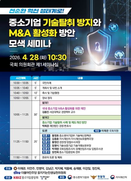 (포탈뉴스통신) 이재관 의원(충남 천안을·더불어민주당)이 오는 28일 오전 10시30분 국회 의원회관 제1세미나실에서 ‘선순환 혁신 생태계로! 중소기업 기술탈취 방지와 M&A 활성화 방안 모색 세미나’를 개최한다고 밝혔다.
