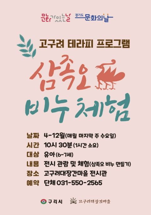 (포탈뉴스통신) 구리시는 4월부터 고구려대장간마을에서 매월 마지막 주 수요일 ‘문화가 있는 날’을 맞아 ‘삼족오 비누 체험! 고구려 치료 프로그램’을 운영한다고 밝혔다.