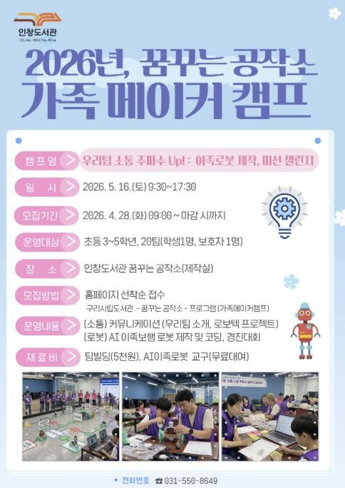 (포탈뉴스통신) 구리시 인창도서관‘꿈꾸는 공작소’는 오는 5월 16일 초등학생 자녀와 보호자가 함께 참여해 가족 간 유대감을 높이고 인공지능을 체험하는 '우리 팀 소통 주파수 Up! : 이족로봇 제작, 미션 챌린지' 가족 메이커 캠프를 운영한다고 밝혔다.