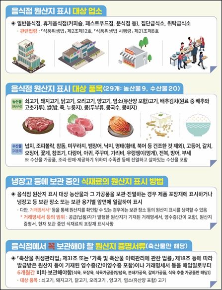 현행 원산지 표시제에 따르면 음식점은 쌀·콩·배추김치 등 농산물 3종과 쇠고기·돼지고기·닭고기 등 축산물 6종, 넙치·고등어·갈치 등 수산물 20개 품목에 대해 원산지를 의무적으로 표시해야 한다.