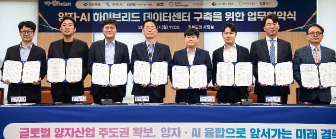 경상북도는 4월 27일 경북도청 회의실에서 황명석 경상북도지사 권한대행, 정성현 구미시장 권한대행을 비롯해 윤지원 ㈜SDT 대표, 신동주 ㈜모빌린트 대표, 문추연 구미전자정보기술원 원장, ㈜I-ESG 김종웅 대표, LS증권(주) 배건 복합금융본부장, ㈜마키나락스 심상우 CTO가 참석한 가운데‘양자·AI 하이브리드 데이터센터 구축을 위한 업무협약(MOU)’을 체결했다.