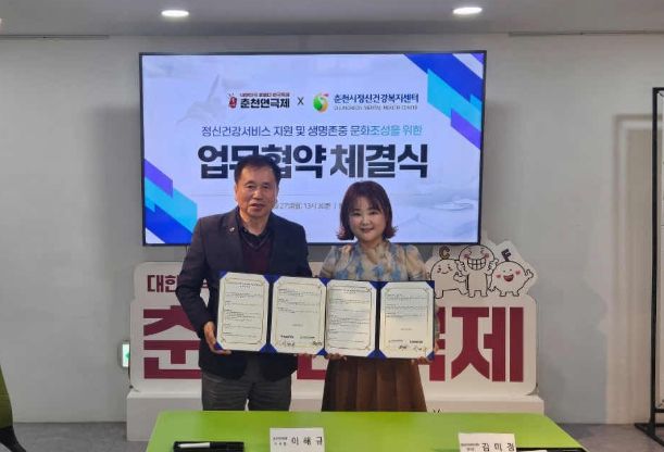 춘천시정신건강복지센터(센터장 김미정)와 (사)춘천연극제는 27일 오후 봄내극장에서 지역사회 정신건강서비스 지원 활성화와 생명존중 문화 확산을 위한 업무협약을 체결했다.