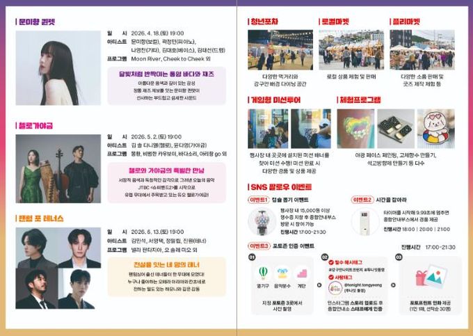 (포탈뉴스통신) 통영시는 오는 5월 2일 강구안 해상무대 및 일원에서 '2026 강구안 나이트 프린지, ‘투나잇 통영 즐거울 樂’'두 번째 공연을 개최한다.