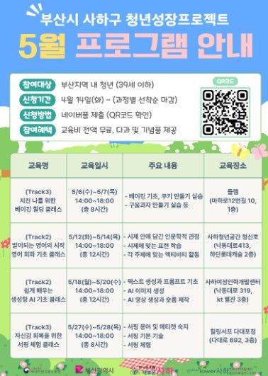참여를 희망하는 청년은 홍보 포스터 내 ‘정보 무늬(QR코드)’를 통해 신청 가능하며, 자세한 사항은 수행기관인 사하여성인력개발센터로 문의하면 된다.