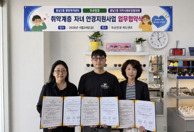 (포탈뉴스통신) 광주시 광남2동 행정복지센터와 지역사회보장협의체는 지역 안경업체 두 손 안경 위드렌즈와 함께 취약계층 아동·청소년의 시력 보호와 학습환경 개선을 위한 안경 지원사업 업무협약을 체결했다고 28일 밝혔다.