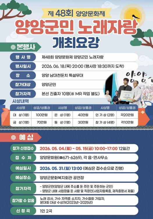 본선 무대에 설 최종 10명을 선발하는 예심은 5월 31일 양양군문화복지회관 공연장에서 열리며, 당일 접수 순서에 따라 심사가 진행될 예정이다.