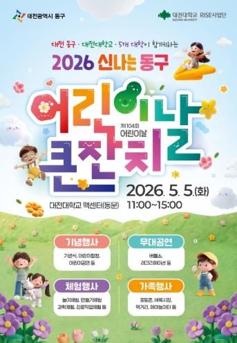 (포탈뉴스통신) 대전 동구는 제104회 어린이날을 맞아 오는 5월 5일 오전 11시부터 대전대학교 맥센터 실내체육관에서 ‘동구 미래의 주인공들과 함께하는 어린이날 큰잔치’를 개최한다고 28일 밝혔다.