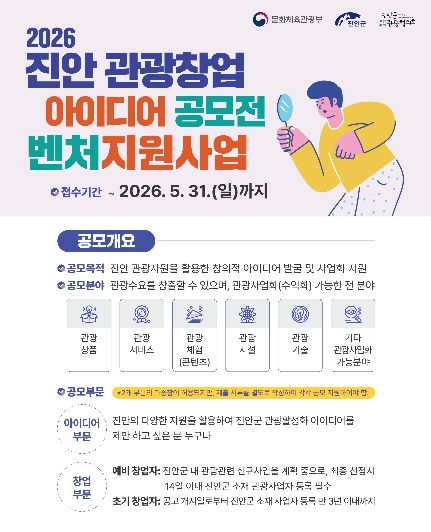 (포탈뉴스통신) (사)진안군관광협의회(이사장 이재동)가 지역 관광자원을 활용한 창의적인 아이디어를 발굴하고 실질적인 사업화를 지원하기 위해 ‘2026 진안 관광창업 아이디어 공모전’을 개최한다.