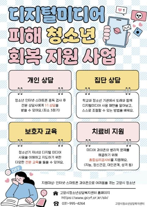 (포탈뉴스통신) 고양시청소년재단 산하 고양시청소년상담복지센터는 디지털 유해환경에 의한 청소년의 디지털 과의존 및 사이버 도박 등의 사회문제를 예방하고 치료하기 위해 오는 5월부터 12월까지 ‘디지털미디어 피해 청소년 회복 지원 사업’을 운영한다고 밝혔다.