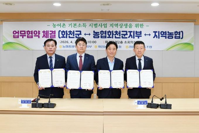 화천군은 지난 27일 군청에서 최문순 군수, 민연홍 농협중앙회 군지부장, 김명규 화천농협 조합장, 오흥선 간동농협 조합장이 참석한 가운데 ‘농어촌 기본소득 시범사업 지역 상생을 위한 업무협약식’을 개최했다.
