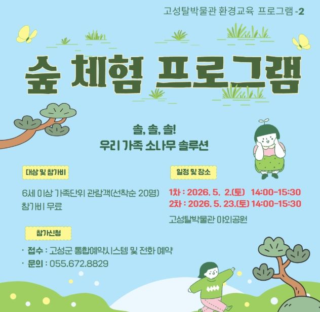 (포탈뉴스통신) 고성탈박물관은 오는 5월 2일과 23일 오후 2시부터 가족 관람객 20명을 대상으로 숲 체험 프로그램을 운영한다.