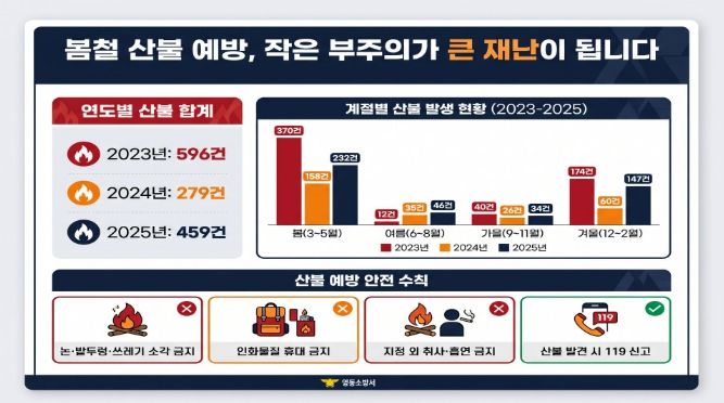 산림청 통계에 따르면 최근 산불은 봄철(3~5월)에 가장 많이 발생하는 것으로 나타났으며, 2025년 기준 전체 산불 459건 중 232건이 봄철에 집중된 것으로 집계됐다.