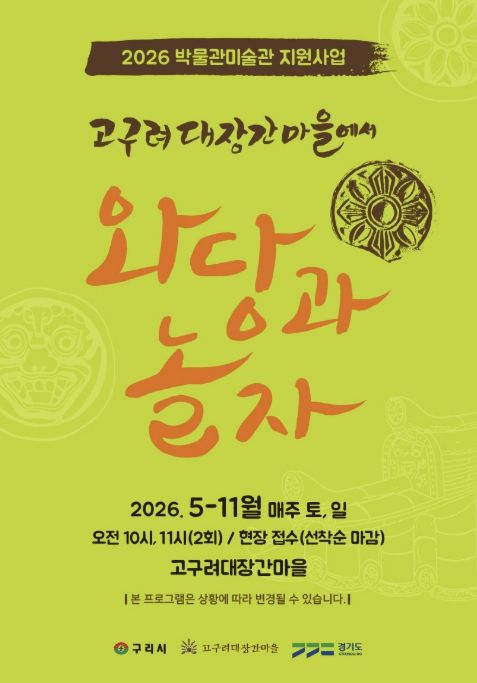 (포탈뉴스통신) 구리시는 오는 5월 2일부터 11월 1일까지 매주 주말 고구려대장간마을에서 2026년 경기도 박물관·미술관 지원사업의 하나로 ‘고구려대장간마을에서 와당과 놀자’ 체험 행사를 운영한다고 밝혔다.