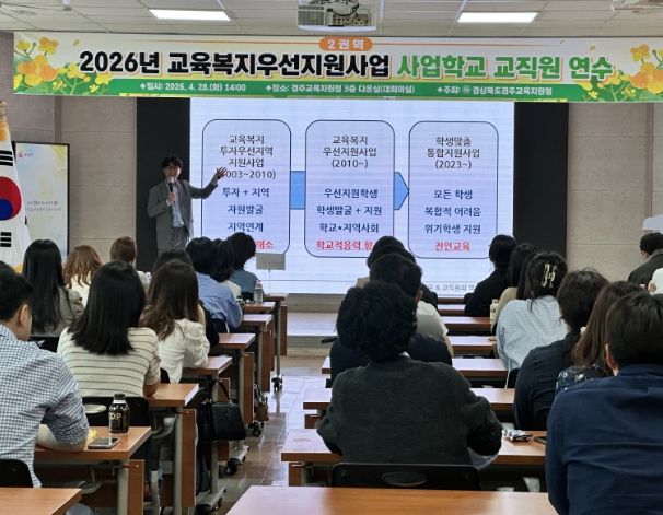 (포탈뉴스통신) 경상북도경주교육지원청은 2026년 4월 28일 경주교육지원청 다온실(3층 대회의실)에서 ‘2026년 교육복지우선지원사업 2권역 사업학교 교직원 연수’를 개최했다.