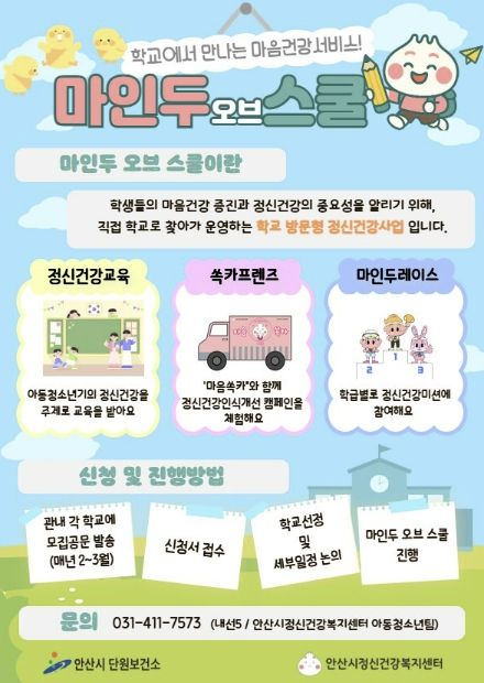 (포탈뉴스통신) 안산시 정신건강복지센터는 11월까지 관내 초·중·고등학교 총 10개교를 대상으로 학교로 찾아가는 정신건강사업 ‘마인두 오브 스쿨’을 운영한다고 30일 밝혔다.