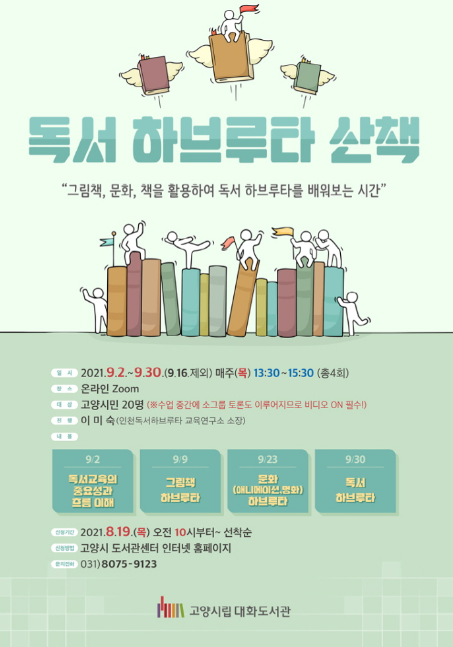 (포탈뉴스) 고양시 대화도서관은 9월 독서의 달을 맞이하여 독서 프로그램‘독서 하브루타 산책’을 9월 2일부터 9월 30일까지 온라인으로 운영한다.