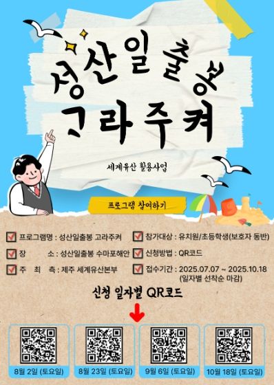 이 프로그램은 성산일출봉 수마포 해안에서 총 4회(8/2, 8/23, 9/6, 10/18)에 걸쳐 사전예약제로 운영되며, 매회 20명의 가족 단위 참가자를 대상으로 10월까지 진행된다.