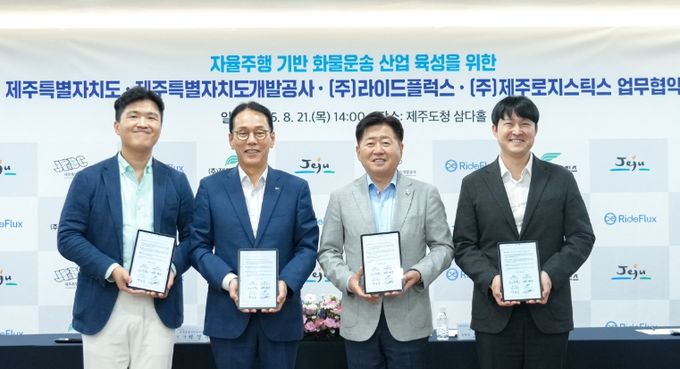 제주도는 21일 도청 삼다홀에서 제주특별자치도개발공사, 자율주행 전문기업 ㈜라이드플럭스, 물류기업 ㈜제주로지스틱스와 ‘자율주행 기반 화물운송 산업 육성’ 업무협약을 체결했다.