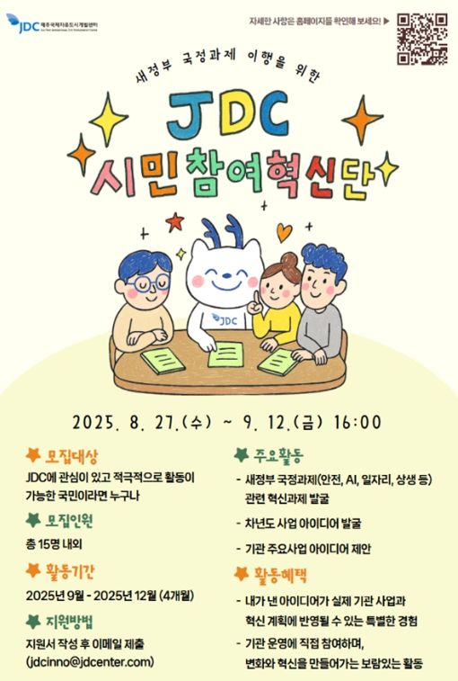 (포탈뉴스통신) 제주국제자유도시개발센터는 시민 참여 확대를 위해 8월 27일부터 9월 12일까지 '새정부 국정과제 이행을 위한 2025년 JDC 시민참여혁신단'을 모집한다고 25일 밝혔다.