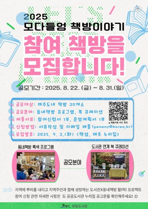 (포탈뉴스통신) 제주시 우당도서관은 지역 독서 생태계 활성화를 위해 ‘2025 모다들엉 책방 이야기’ 사업에 참여할 동네책방을 오는 8월 31일까지 모집한다.