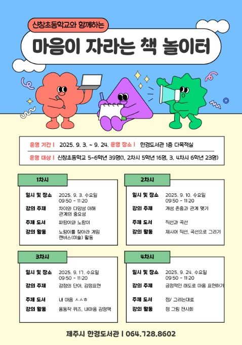 (포탈뉴스통신) 제주시 한경도서관은 신창초등학교와 함께 오는 9월 3일부터 24일까지 매주 수요일 오전 9시 50분 도서관 다목적실에서 ‘마음이 자라는 책 놀이터’ 프로그램을 운영한다.