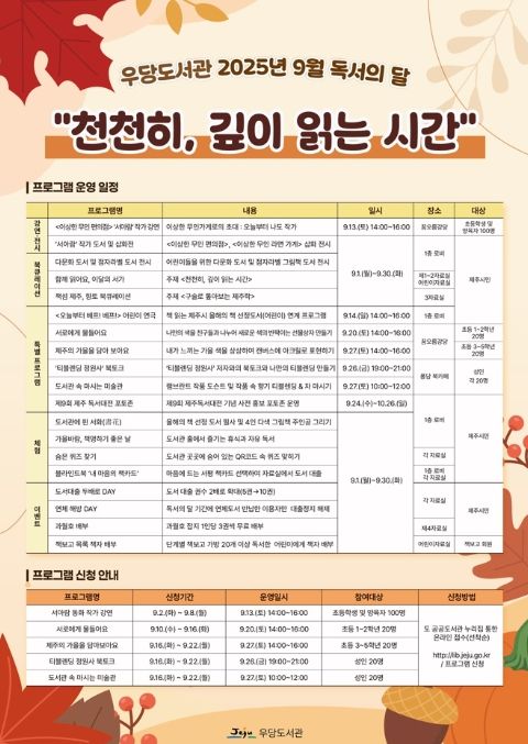 (포탈뉴스통신) 제주시 우당도서관은 제주의 가을, 바람처럼 스며드는 책 향기가 시민들의 일상에 머무를 수 있도록 오는 9월 특별한 한 달을 준비했다.