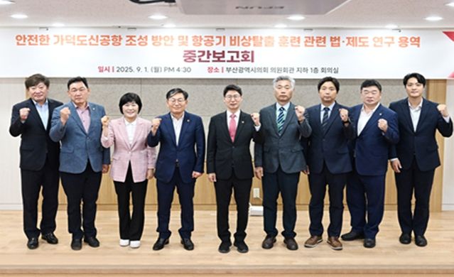 (포탈뉴스통신) 부산광역시의회 의원연구단체 ‘가덕도신공항 추진 연구모임(대표 송현준 의원)’은 최근(1일), 부산광역시의회에서 ‘안전한 가덕도신공항 조성 방안 및 항공기 비상탈출 훈련 관련 법·제도 연구’ 용역 중간보고회 및 간담회를 개최했다.