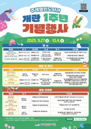 (포탈뉴스통신) 부산 사상구 주례열린도서관은 개관 1주년을 맞아 지역주민들의 성원과 관심에 보답하고자 오는 9월 27일부터 10월 4일까지 다양한 기념행사를 진행한다.