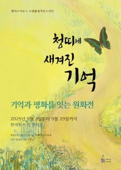 (포탈뉴스통신) 제주특별자치도 한라도서관(관장 양애옥)과 노형꿈틀작은도서관(관장 양재성)은 오는 9월 3일부터 9월 29일까지 한라도서관 1층 전시실에서 ‘청띠에 새겨진 기억: 기억과 평화를 잇는 그림책 전시’를 공동 개최한다고 밝혔다. 이는‘독서의 달’을 기념하여 제주 4·3의 비극을 예술로 승화한 특별한 전시로 제주도민들을 만나게 된다.