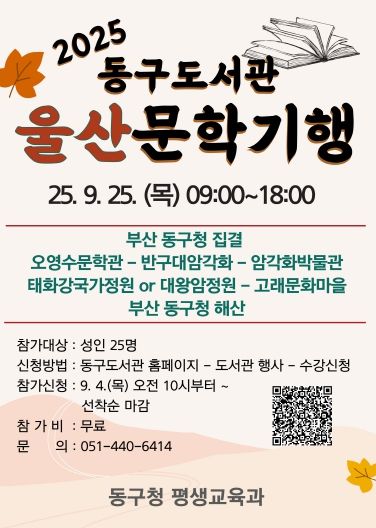 (포탈뉴스통신) 부산광역시 동구도서관은 오는 9월 25일 가을빛 울산 문학기행을 진행한다.