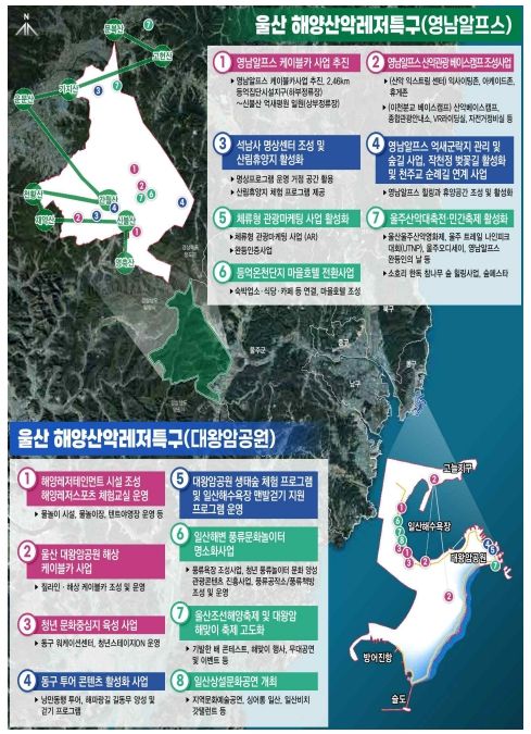 주요 세부 사업으로는 동구 일산해수욕장(대왕암공원)과 울주군 영남알프스 일원에는 해양·산악레저 스포츠 거점 공간 조성, 관광 콘텐츠 개발, 상표화·홍보(브랜딩·마케팅) 사업 등이 추진된다.