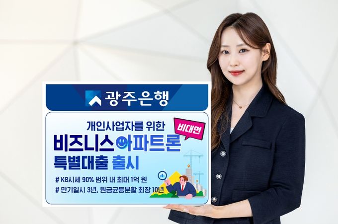 (포탈뉴스통신) 광주은행(은행장 고병일)은 개인사업자가 영업점을 방문하지 않고도 아파트를 담보로 사업 운영자금을 대출받을 수 있는 비대면 ‘비즈니스아파트론 특별대출’을 출시했다고 밝혔다.