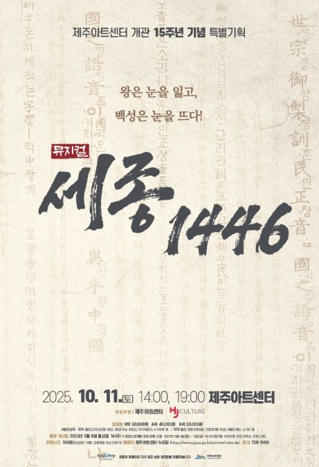 (포탈뉴스통신) 제주아트센터는 개관 15주년을 맞아 대형 창작 뮤지컬 ‘세종, 1446’을 10월 11일 오후 2시와 7시 특별기획 공연으로 선보인다.