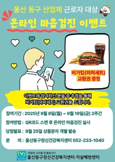 (포탈뉴스통신) 울산동구정신건강복지센터(센터장 전진용)는 자살예방의 날(9월 10일)을 기념하여 9월 8일부터 2주간 동구 관내 산업체 근로자 100명을 대상으로 온라인 조기 검진 이벤트를 운영한다.