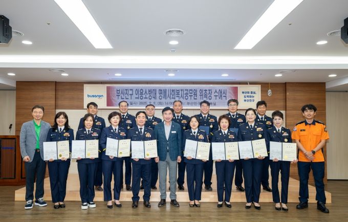 위촉장 수여식에는 부산진소방서 남성의용소방대장 황한성 등 20여 명이 참석했으며, 전체 위촉 대상자를 대표해 각 지역대 남·여 의용소방대장에게 명예사회복지공무원 위촉장을 수여했다.