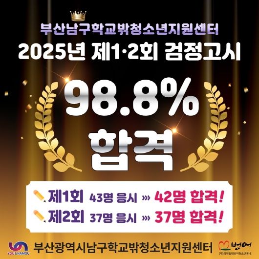(포탈뉴스통신) 부산광역시 남구 학교 밖 청소년 지원센터 소속 학교 밖 청소년들이 2025년도 상․하반기별 각 1회씩 치뤄진 검정고시에 79명이 합격하는 성과를 기록했다.
