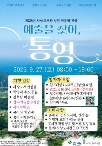 (포탈뉴스통신) 부산 사상구는 사상도서관에서 오는 9월 27일 통영으로 떠나는 성인 인문학 기행을 운영한다고 밝혔다.