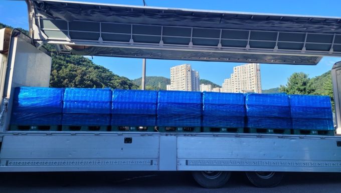 광주시는 상수도사업본부 용연정수장에서 생산한 빛여울수를 상무대 51군수지원단 14t 트럭 1대, 5t 트럭 2대에 실어 강릉시에 전달했다.