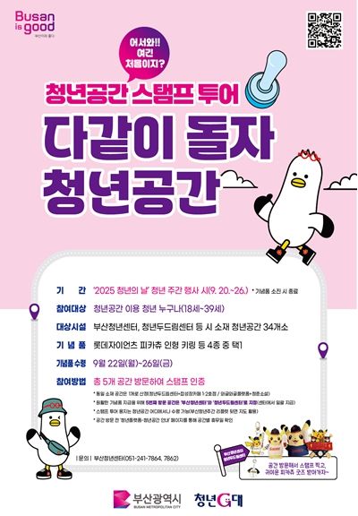 (포탈뉴스통신) 부산시는 청년의 날(9월 20일)을 맞아, 오는 9월 20일부터 26일까지 부산청년주간 동안 '청년공간 스탬프 투어 – 다같이 돌자, 청년공간'을 운영한다고 밝혔다.