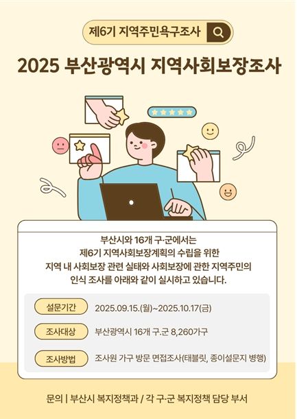 (포탈뉴스통신) 부산시는 16개 구·군과 함께 오는 9월 15일부터 10월 17일까지 5주간 '2025년 부산광역시 지역사회보장조사'를 실시한다고 밝혔다.