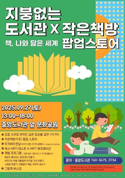 (포탈뉴스통신) 서귀포시도서관운영사무소는 오는 9월 27일 오후 1시부터 6시까지 중앙도서관 및 문화공원에서 지역 책방이 참여하는 '로컬북스 팝업스토어'와 야외 독서문화 행사 '지붕없는 도서관'을 함께 개최한다.