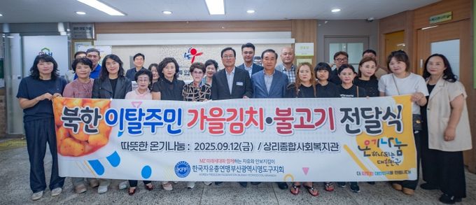 (포탈뉴스통신) 한국자유총연맹 부산시 영도구지회(회장 김종갑)는 지난 9월 12일 상리종합사회복지관에서 북한이탈주민 가을 김치·불고기 온기나눔 전달식을 개최했다.