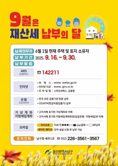 (포탈뉴스통신) 울산 남구는 올해 9월 정기분 재산세 8만 830건, 676억 원을 부과·고지하고 납세자들이 납기 내 납부할 수 있도록 적극 홍보에 나섰다.