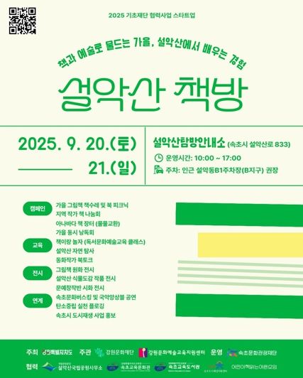 (포탈뉴스통신) 속초문화관광재단은 9월 20일부터 21일까지 이틀간 설악산 탐방안내소 일원에서 ‘설악산 책방’을 개최한다. 본 행사는 강원문화재단 ‘2025 기초재단 협력사업 스타트업’에 3년 연속 선정된 사업의 일환이다.