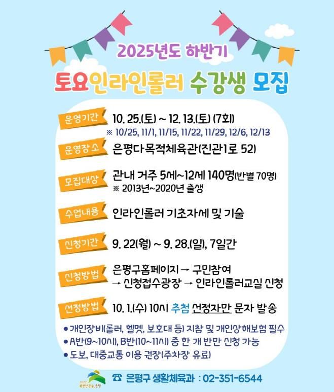 (포탈뉴스통신) 서울 은평구는 관내 어린이의 생활체육능력 향상을 위한 ‘하반기 토요 인라인롤러 교실’ 참여자를 오는 22일부터 28일까지 모집한다고 밝혔다.