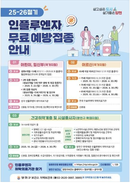이를 위해 구는 지난 6월 '서울특별시 양천구 인플루엔자 예방접종 지원에 관한 조례'를 개정하고 추가경정예산 3억 원을 확보했다. 이번 조치로 기초수급자와 차상위계층, 등록장애인 등이 올해부터 독감 예방접종을 무료로 받게 된다.