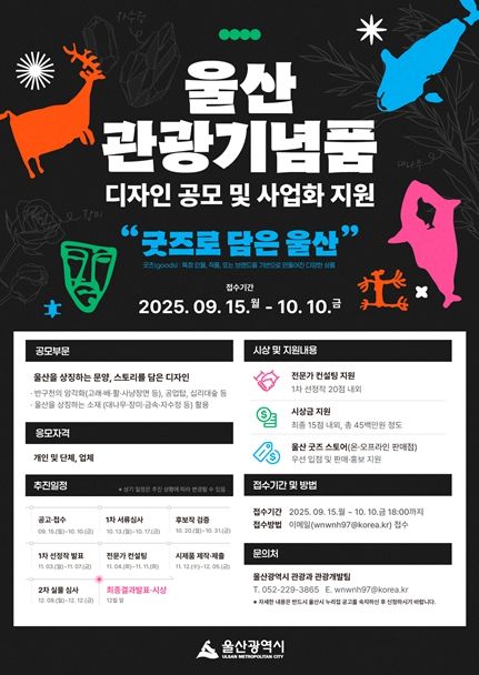 울산시 관계자는 “최근 케이팝 데몬 헌터스 열풍으로 케이(K)-관광기념품(굿즈)에 대한 관심이 높아진 만큼, 반구천의 암각화·공업탑·십리대숲·고래 설화 등 다양한 소재를 활용하여 울산을 상징할 수 있는 차별화된 작품이 나오길 기대한다”라며 “울산만의 독특한 정체성을 담아낼 관광기념품 개발에 많은 관심과 참여를 바란다”라고 말했다.