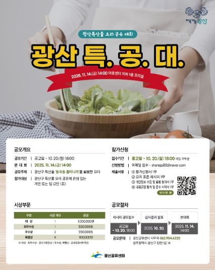 참여 대상은 광산구 특산물 요리 공유에 관심이 있는 개인 또는 2인 1조 팀이며, 10월 20일 오후 6시까지 광산공유센터 누리집 공고문을 참고해 전자우편으로 접수하면 된다.