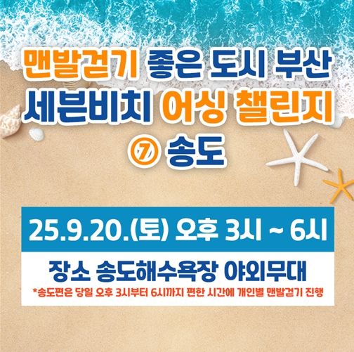'세븐비치 어싱챌린지'는 부산의 대표 해수욕장 7곳을 맨발로 모래 위를 걷고 바닷바람을 맞으며 자연 접지(Earthing) 활동을 체험하는 프로그램으로, 시민의 심신 건강 증진과 해양 힐링 콘텐츠 확산에 기여해 왔다.