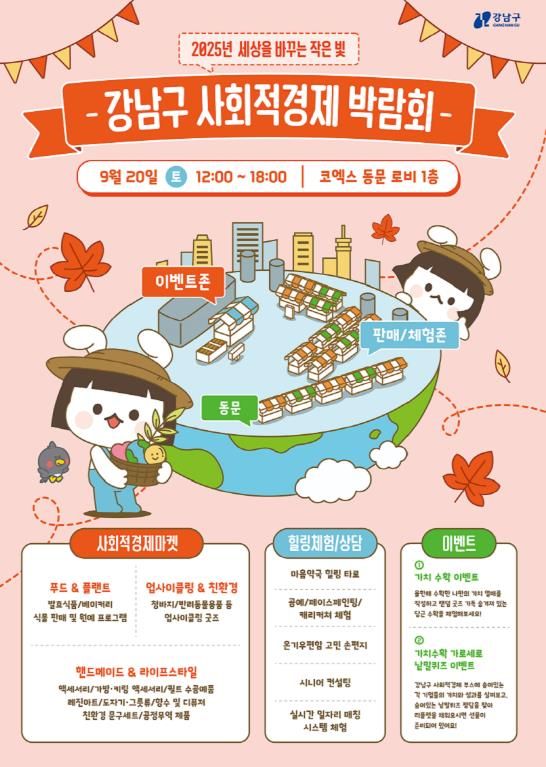 (포탈뉴스통신) 꿈이 모이는 도시, 미래를 그리는 강남구가 오는 9월 20일 낮 12시부터 오후 6시까지 코엑스 동문 로비 1층에서 ‘2025 강남구 사회적경제박람회’를 개최한다. 올해 행사는 기존 강남역 야외무대에서 벗어나 실내 공간에서 열리며, 사회적경제기업 30여 개소가 참여한다.